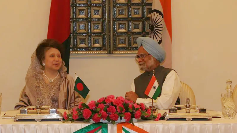 ২০০৬ সালের ২১শে মার্চ ভারতের নয়াদিল্লিতে হায়দ্রাবাদ হাউসে ভারতের তৎকালীন প্রধানমন্ত্রী মনমোহন সিংয়ের সাথে খালেদা জিয়া।