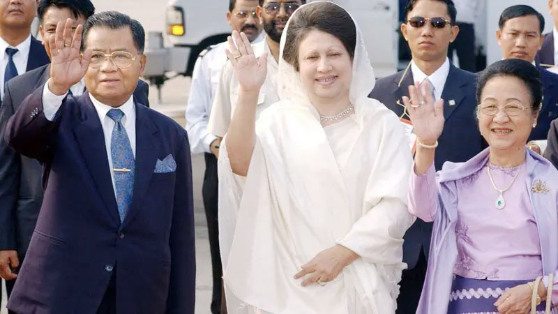 ২০০২ সালের ১৮ই ডিসেম্বর ঢাকার তৎকালীন জিয়া আন্তর্জাতিক বিমানবন্দরে বিদায়ের সময় মিয়ানমারের জান্তা নেতা সিনিয়র জেনারেল থান শোয়ে (বামে) এবং তার স্ত্রী দাউ কিয়াইং কিয়াইং-র (ডানে) সাথে বাংলাদেশের প্রধানমন্ত্রী খালেদা জিয়া গণমাধ্যমের উদ্দেশ্যে হাত নাড়েন। সেই সফরে থান শোয়ে দুই প্রতিবেশী দেশ বাংলাদেশ ও মিয়ানমারের অর্থনৈতিক চ্যালেঞ্জ মোকাবেলায় দ্বিপাক্ষিক সম্পর্ক জোরদার করার প্রতিশ্রুতি দেন।