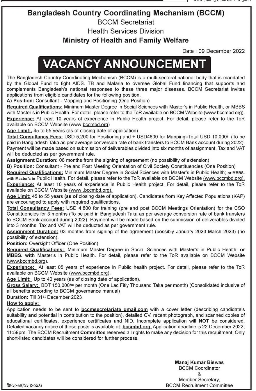 স্বাস্থ্য ও পরিবার কল্যাণ মন্ত্রণালয় সম্প্রতি নিয়োগ বিজ্ঞপ্তি দিয়েছে। প্রতিষ্ঠানটি তাদের স্বাস্থ্য সেবা বিভাগের আওতাধীন বাংলাদেশ কান্ট্রি কোঅর্ডিনেটিং মেকানিজমে (বিসিসিএম) লোকবল নিয়োগ দেবে। আগ্রহীরা অনলাইনে আবেদন করতে হবে।