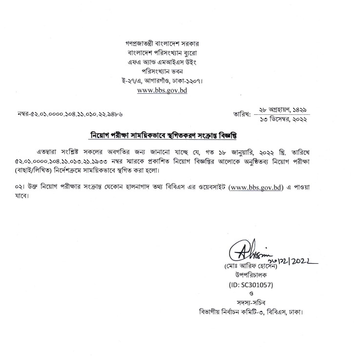 পরিসংখ্যান ব্যুরোর নিয়োগ পরীক্ষা স্থগিত