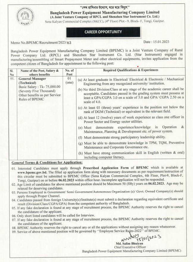 পদের নাম: জেনারেল ম্যানেজার (টেকনিক্যাল)। পদের সংখ্যা: ১। আবেদন যোগ্যতা: স্বীকৃত বিশ্ববিদ্যালয়/ প্রতিষ্ঠান থেকে ইলেকট্রিক্যাল/ ইলেকট্রিক্যাল অ্যান্ড ইলেকট্রনিক/ মেকানিক্যাল ইঞ্জিনিয়ারিং বিষয়ে স্নাতক ডিগ্রি থাকতে হবে।
