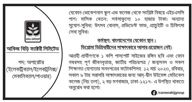 আকিজ বিড়ি ফ্যাক্টরি লিমিটেড সম্প্রতি নিয়োগ বিজ্ঞপ্তি দিয়েছে। প্রতিষ্ঠানটি তাদের ইলেকট্রিক্যাল ইলেকট্রনিক্স মেকানিক্যাল/ পাওয়ার বিভাগে লোকবল নিয়োগ দেবে। আগ্রহীরা সরাসরি আবেদন করতে পারবেন।