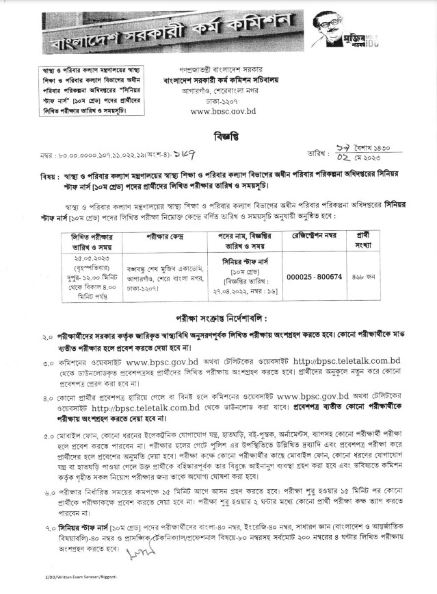 সিনিয়র স্টাফ নার্স পদের লিখিত পরীক্ষার তারিখ প্রকাশ