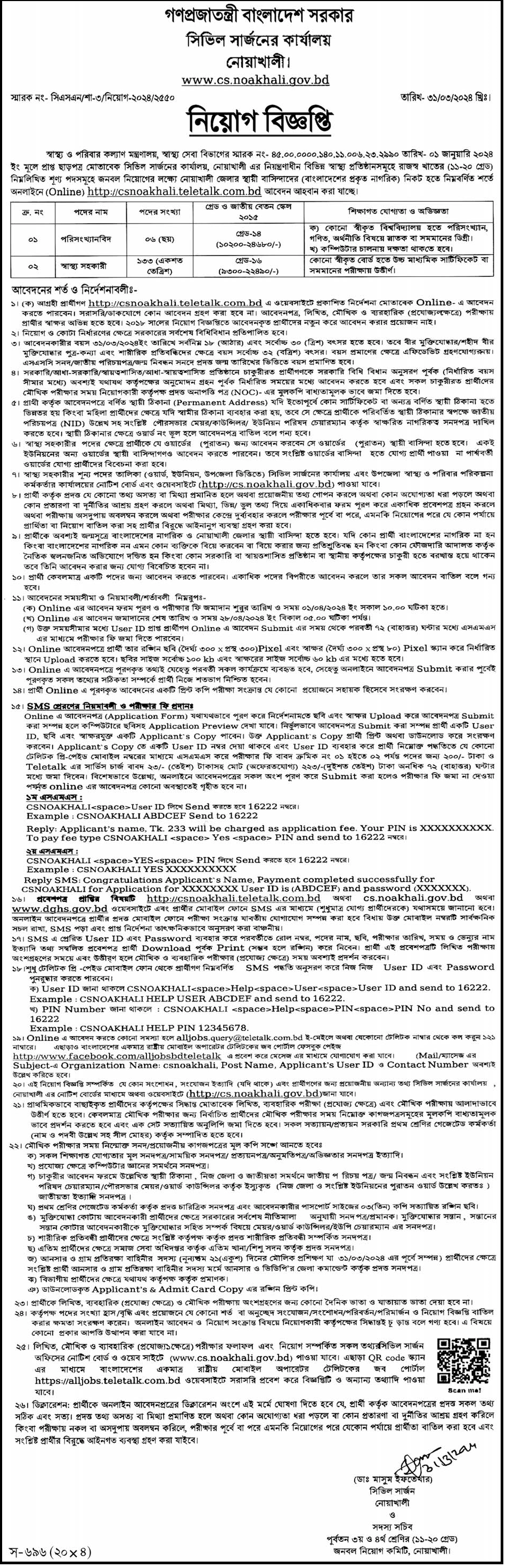 স্বাস্থ্য ও পরিবার কল্যাণ মন্ত্রণালয়, স্বাস্থ্য সেবা বিভাগের ছাড়পত্র মোতাবেক সিভিল সার্জনের কার্যালয়, নোয়াখালী এর নিয়ন্ত্রণাধীন বিভিন্ন স্বাস্থ্য প্রতিষ্ঠানসমূহে রাজস্ব খাতে বিভিন্ন গ্রেডে নিয়োগ বিজ্ঞপ্তি প্রকাশ করেছে। প্রতিষ্ঠানটির দুটি শূন্য পদে ১৩৯ জনকে নিয়োগের জন্য এ বিজ্ঞপ্তি দিয়েছে। ০১ এপ্রিল থেকে আবেদন নেওয়া শুরু হয়েছে। আবেদন করা যাবে আগামী ২৮ এপ্রিল পর্যন্ত। আগ্রহী প্রার্থীরা অনলাইনে আবেদন করতে পারবেন। প্রতিটি পদের জন্য টেলিটকের সার্ভিস চার্জসহ ২২৩ টাকা জমা দিতে হবে।