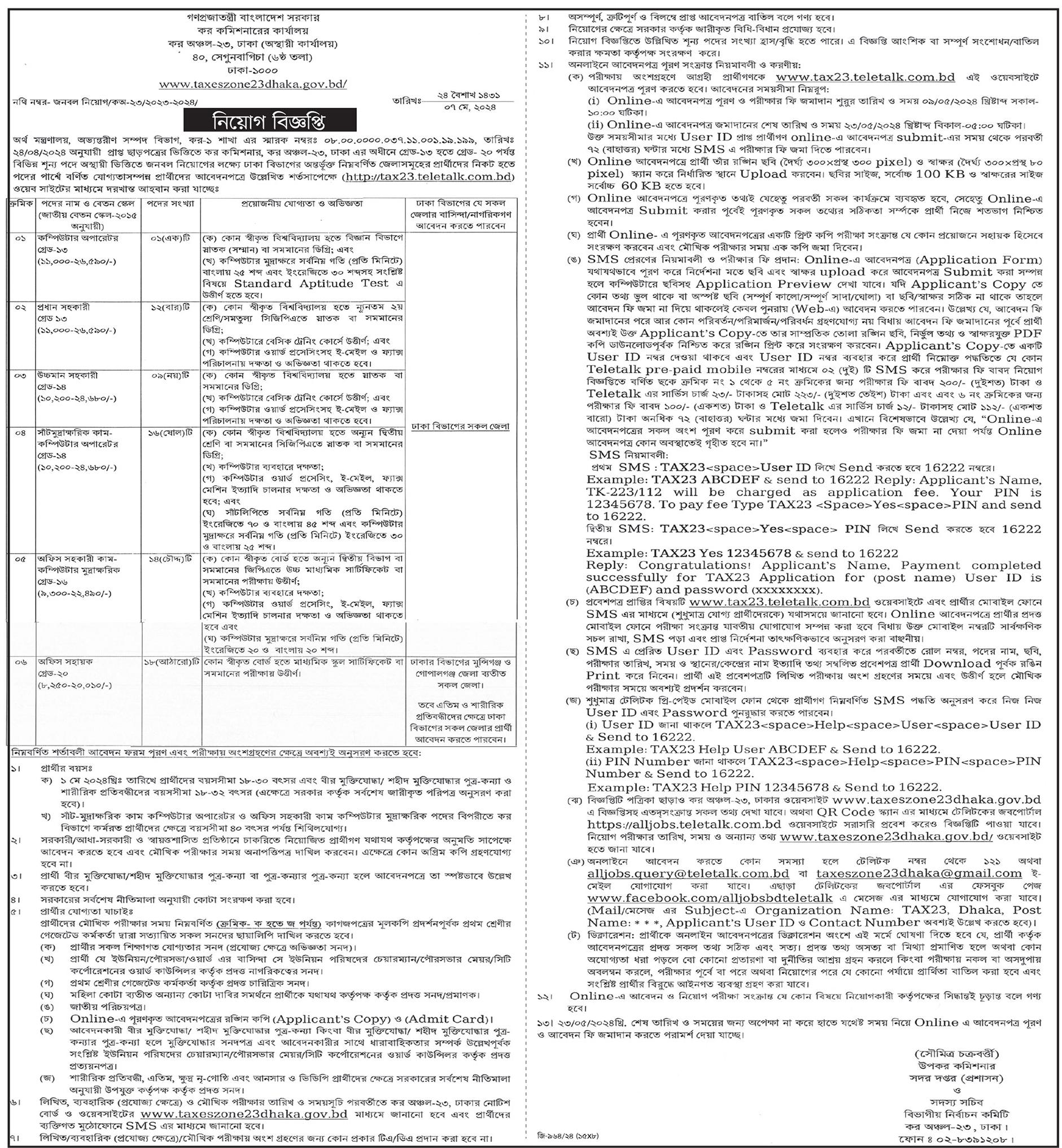 কর কমিশনারের কার্যালয় (কর অঞ্চল-২৩ ঢাকা) নিয়োগ বিজ্ঞপ্তি প্রকাশ করেছে। প্রতিষ্ঠানটির ছয়টি শূন্য পদে ১৩ থেকে ২০ তম গ্রেডে ৭০ জনকে নিয়োগের জন্য এ বিজ্ঞপ্তি দিয়েছে। ০৯ মে থেকে আবেদন নেওয়া শুরু হবে। আবেদন করা যাবে আগামী ২৩ মে পর্যন্ত। আগ্রহী প্রার্থীরা অনলাইনে আবেদন করতে পারবেন।