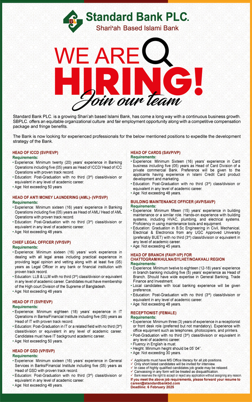 অভিজ্ঞতা: কোনো ব্যাংকে অন্তত ১৬ বছর চাকরির অভিজ্ঞতা থাকতে হবে। এর মধ্যে হেড অব এএমএল/হেড অব এএমএল অপারেশনস পদে অন্তত পাঁচ বছর কাজের অভিজ্ঞতা থাকতে হবে। এমএস অফিস অ্যাপ্লিকেশনের কাজ জানতে হবে।