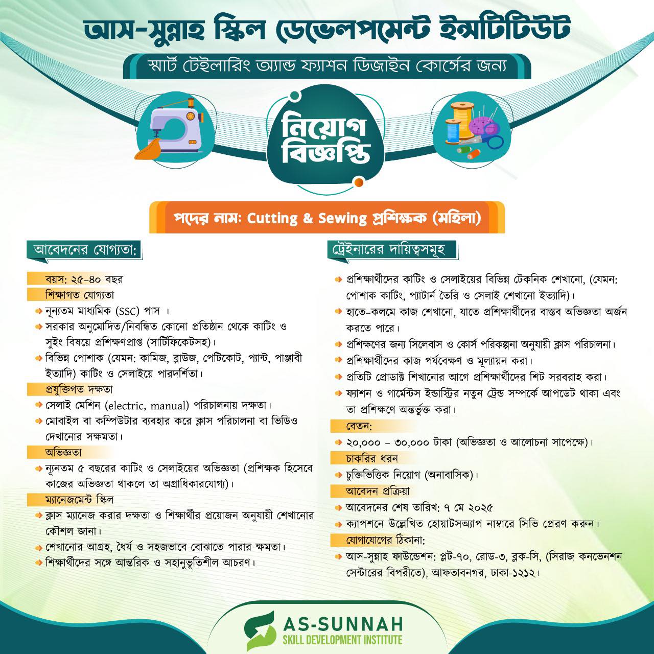 আস-সুন্নাহ ফাউন্ডেশন নিয়োগ বিজ্ঞপ্তি প্রকাশ করেছে। মানবকল্যাণে নিবেদিত সেবামূলক প্রতিষ্ঠানটির স্কিল ডেভেলপমেন্ট ইন্সটিটিউট-এর স্মার্ট টেইলারিং অ্যান্ড ফ্যাশন ডিজাইন কোর্সের জন্য Cutting & Sewing প্রশিক্ষক (মহিলা) পদে জনবল নিয়োগের জন্য এ বিজ্ঞপ্তি দিয়েছে। ০১ মে থেকেই আবেদন নেওয়া শুরু হয়েছে। আবেদন করা যাবে আগামী ০৭ মে পর্যন্ত। ০১৪০৯-৯৭৯৯৫৪ শুধুমাত্র এই হোয়াটসঅ্যাপ নম্বারে সিভি প্রেরণ করতে হবে।