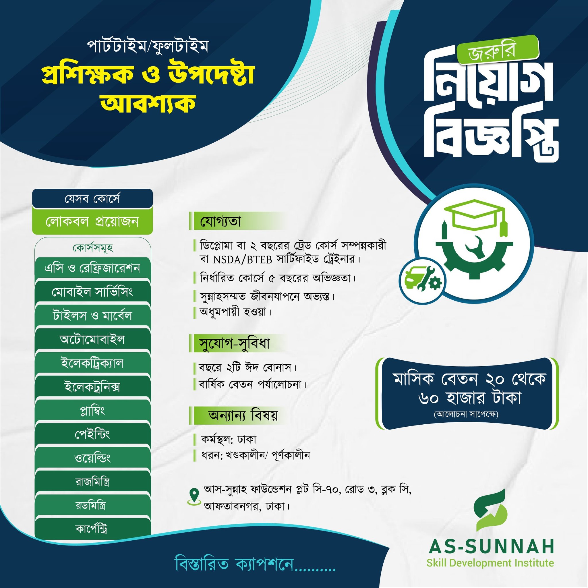 আস-সুন্নাহ ফাউন্ডেশন নিয়োগ বিজ্ঞপ্তি প্রকাশ করেছে। মানবকল্যাণে নিবেদিত সেবামূলক প্রতিষ্ঠানটির স্কিলের নতুন চালু হতে যাওয়া ১২টি কোর্সে পার্টটাইম/ফুলটাইম প্রশিক্ষক ও উপদেষ্টা নিয়োগের জন্য এ বিজ্ঞপ্তি দিয়েছে। আবেদন করা যাবে আগামীকাল ২০ মে পর্যন্ত। আগ্রহী প্রার্থীদের গুগল ফরমে আবেদন করতে হবে।