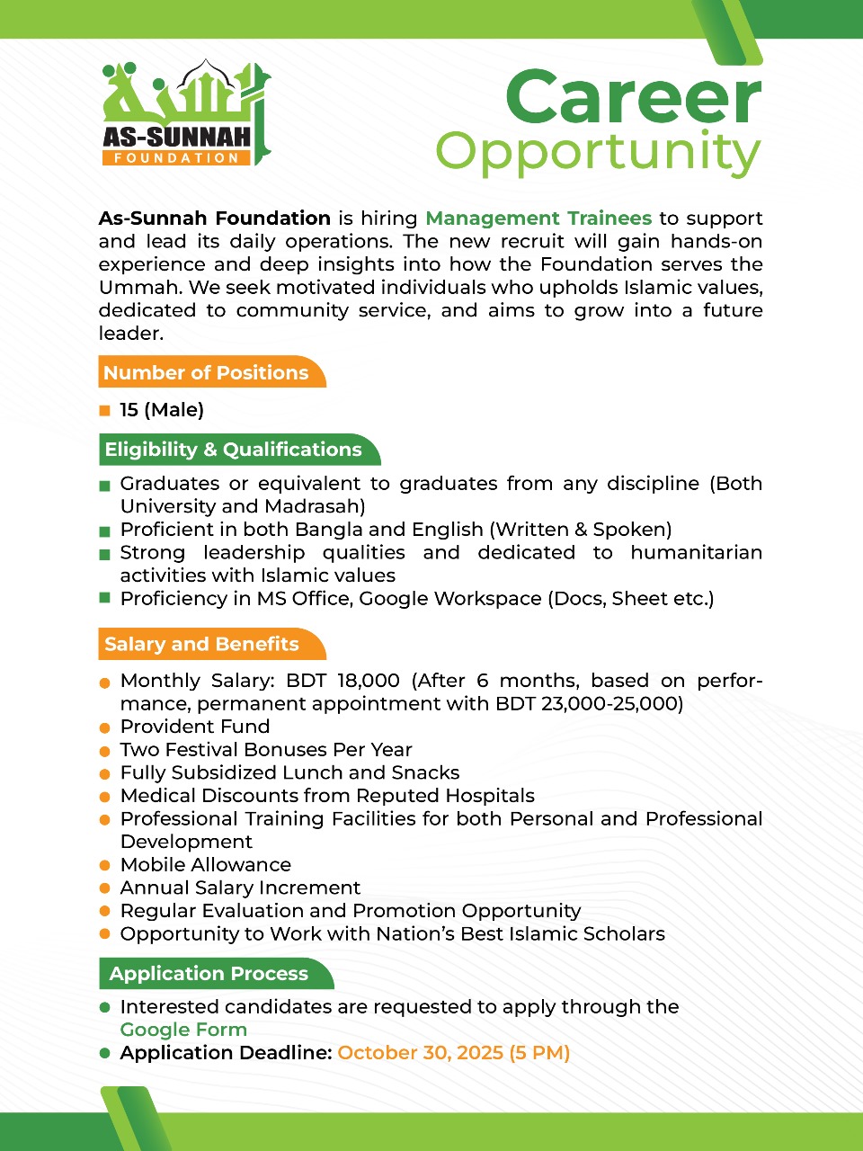 এক নজরে আস-সুন্নাহ ফাউন্ডেশনে নিয়োগ বিজ্ঞপ্তি ২০২৫