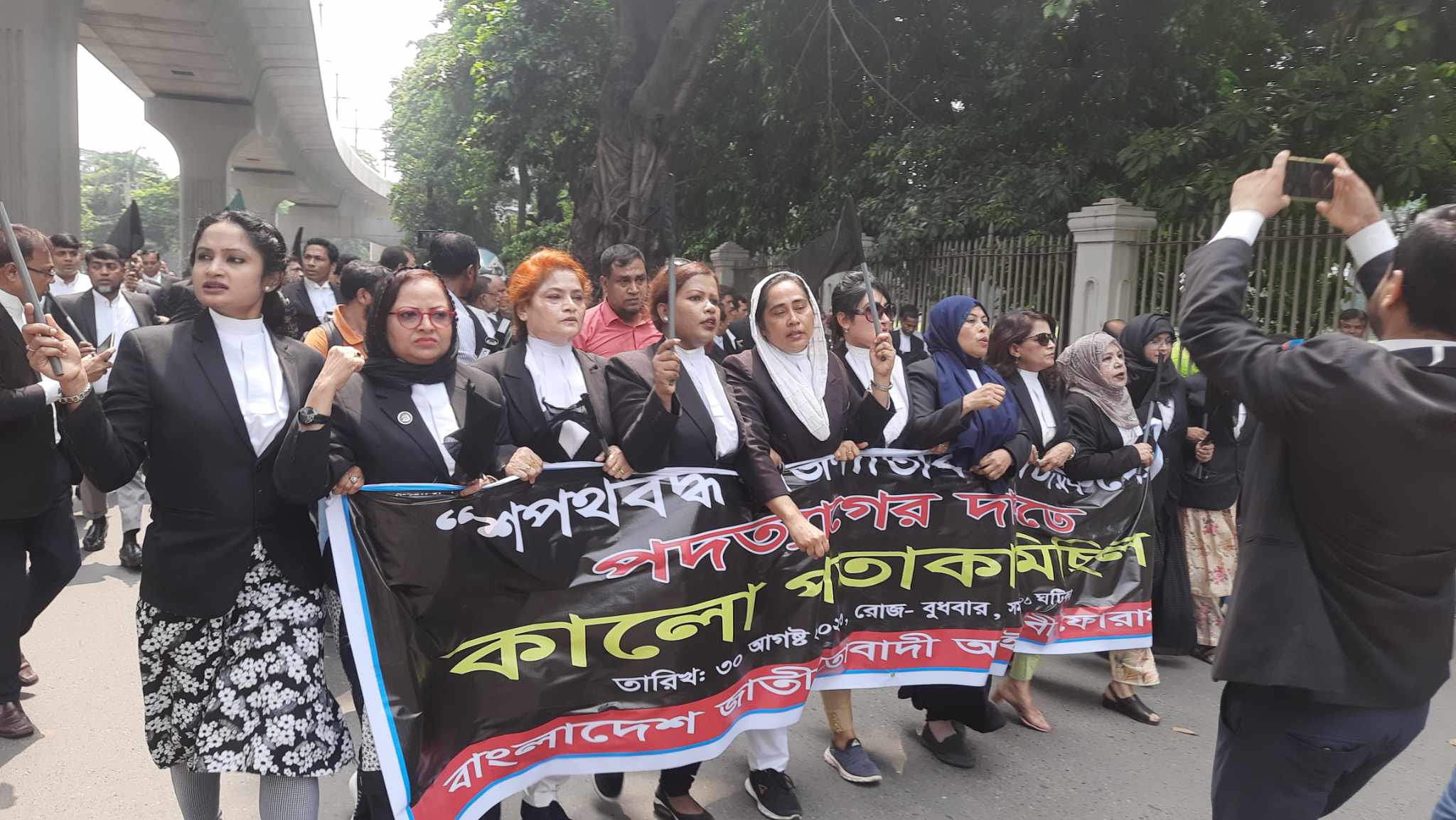বুধবার (৩০ আগস্ট) দুপুর ১টা ১৫ মিনিটের সুপ্রিম কোর্ট বার ভবনের প্রবেশমুখে বিএনপির আইনজীবীরা সমবেত হন। এরপর কালো পতাকা হাতে সুপ্রিম কোর্ট প্রাঙ্গণের বাইরে হাইকোর্টের মাজার গেট থেকে মিছিল শুরু করেন। তবে সুপ্রিম কোর্ট প্রাঙ্গণে তারা কোনো ধরনের শ্লোগান দেননি।