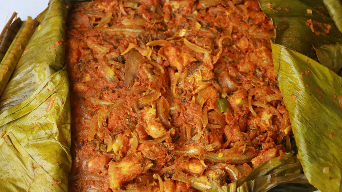 একটি কচি কলাপাতা পরিষ্কার করে মুছে মাঝের মোটা অংশে ছুরি দিয়ে দাগ কেটে নিন। এতে মাছের মিশ্রণ মোড়ানোর সময় ছিঁড়ে যাবে না পাতা। কলাপাতার মাঝে পাতলা করে মসলামাখা মাছ বিছিয়ে চারপাশ থেকে পাতা মুড়ে ঢেকে দিন। তেল বা মসলা যেন বের হতে না পারে সেজন্য আরও একটি পাতা দিতে মুড়িয়ে টুথপিক ও সুতা দিয়ে আটকে নিন ভালো করে।
