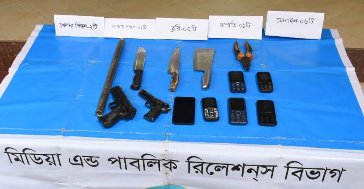 গ্রেপ্তারের সময় তাদের হেফাজত থেকে দুটি খেলনা পিস্তল, ২টি ছুরি, ১টি চাপাতি, ১টি লোহার পাইপ, ১টি প্লাস ও ৬টি মোবাইল ফোন উদ্ধার করা হয়েছে।