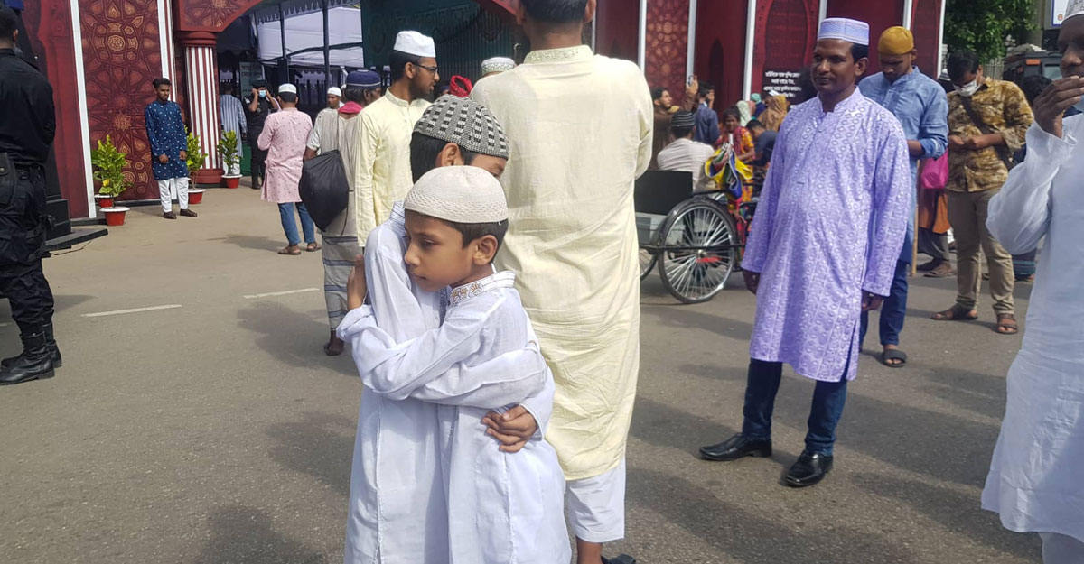 নামাজ শেষে ধর্মপ্রাণ মুসল্লিরা কোলাকুলির পাশাপাশি ঈদের শুভেচ্ছা বিনিময় করেন।