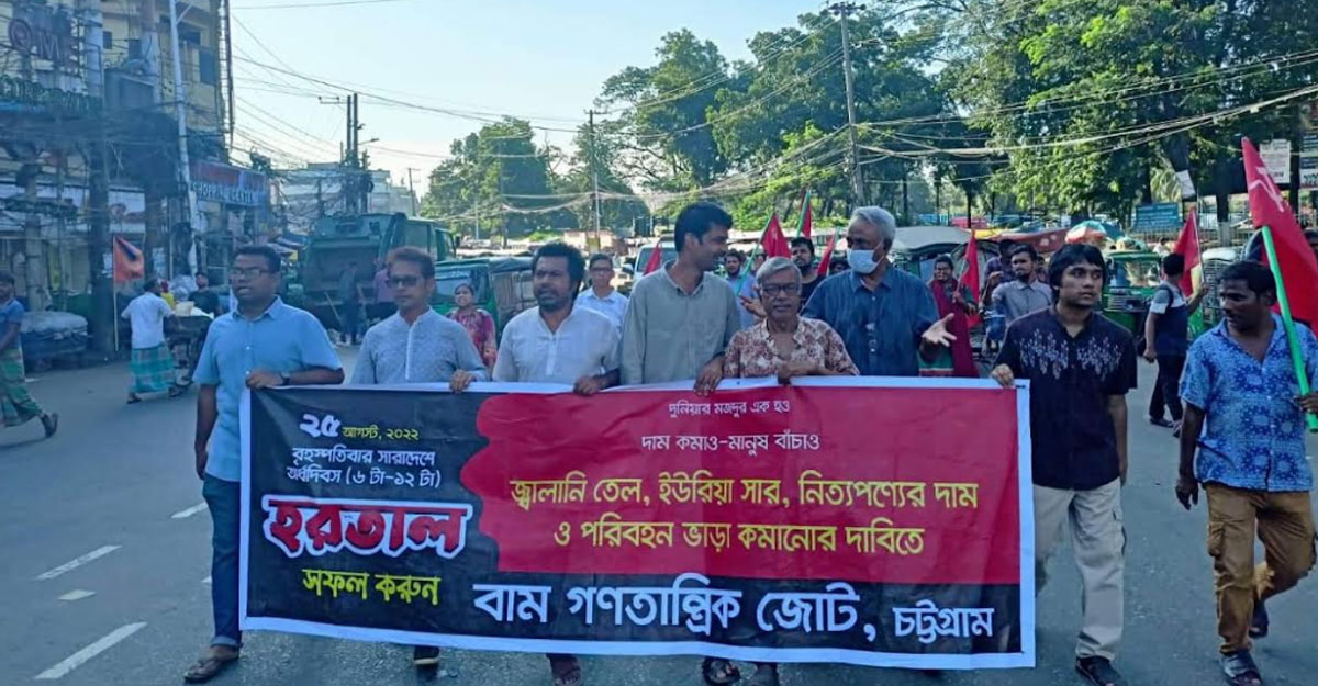 জ্বালানি তেল, সার, খাদ্যসহ নিত্যপণ্যের দাম ও পরিবহনের ভাড়া কমানো এবং বিদ্যুৎ-গ্যাসের দাম বাড়ানোর প্রক্রিয়া বন্ধের দাবিতে চট্টগ্রামে বাম গণতান্ত্রিক জোটের ডাকা অর্ধদিবসের হরতাল চলছে। বৃহস্পতিবার (২৫ আগস্ট) সকাল ৬টা থেকে শুরু হওয়া হরতাল চলবে দুপুর ১২টা পর্যন্ত।