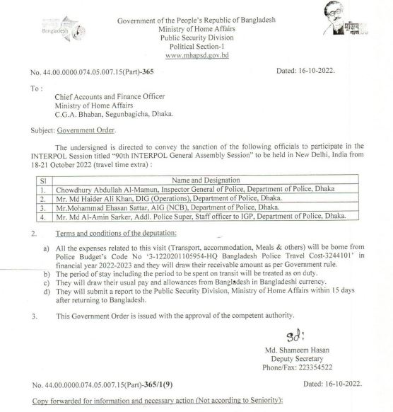আন্তর্জাতিক পুলিশ সংস্থা- ইন্টারপোলের ৯০তম সাধারণ সম্মেলনে অংশ নিতে ভারত যাচ্ছেন পুলিশের মহাপরিদর্শক (আইজিপি) চৌধুরী আবদুল্লাহ আল-মামুন।