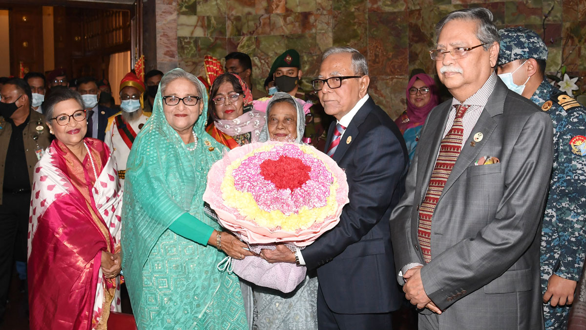 প্রধানমন্ত্রী শেখ হাসিনা, নবনির্বাচিত রাষ্ট্রপতি মো. শাহাবুদ্দিন, তার সহধর্মিনী বঙ্গভবনে পৌঁছালে তাদের ফুলেল শুভেচ্ছা জানান রাষ্ট্রপতি আবদুল হামিদ ও তার সহধর্মিনী রাশিদা খানম।