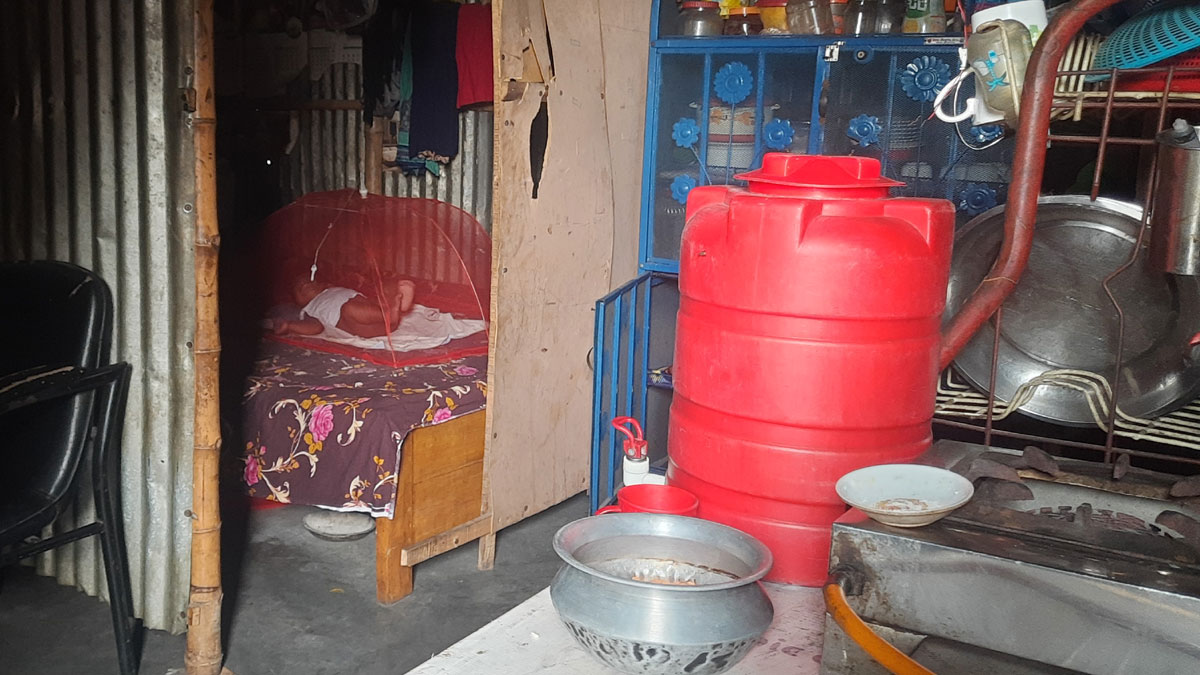 পোড়া বস্তির ভেতরে গিয়ে দেখা যায়, মানুষের বসবাস ছোট ছোট খুপড়ি ঘরে। সব ঘর পাশাপাশি। অনেকগুলো ঘরের মাঝে চলাচলের জন্য সরু গলি পথ। বস্তির পেছনে বিশাল পুকুর। মশার বিস্তারক্ষেত্র হয়ে উঠেছে পুকুরটি। পুকুর ঘেঁষে এক বাসিন্দার ঘর থেকে আসছিল কান্নার আওয়াজ। কাছে গিয়ে দেখা যায়, মশার কামড়ে অতিষ্ঠ এক বাচ্চা কাঁদছে। তার মা দ্রুত মশারি খাটিয়ে বাচ্চাকে শুইয়ে দিচ্ছেন।