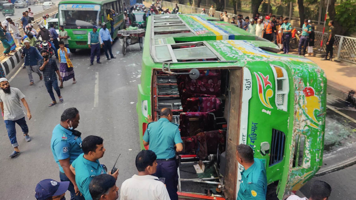 রাজধানীতে আইল্যান্ডে ধাক্কা খেয়ে উল্টে গেল বাস