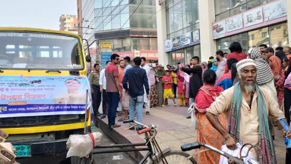 গৃহকর্মীর কাজ করেন ফরিদা বেগম। দুই মেয়ে আর এক ছেলে নিয়ে পাঁচ সদস্যের পরিবার তার। তিনি বলেন, ‘দূর থ্যাইক্যা দেখলাম মামারা খাওন দিতাছে, প্রতিবছর কেউ না কেউ দেয়। কিন্তু এইবার কারোডা পাই নাই। আইজক্যা প্রথম পাইলাম, ম্যালা