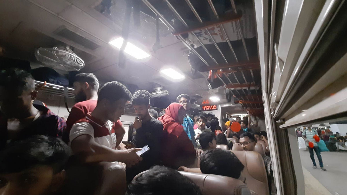 বৃহস্পতিবার রাতে কমলাপুর রেলওয়ে স্টেশনে দেখা গেছে, রাত ৮টায় ৩নং প্ল্যাটফর্মে প্রবেশ করে দ্রুতযান এক্সপ্রেস। প্রবেশের সঙ্গে সঙ্গেই মানুষে কানায় কানায় পূর্ণ হয়ে যায় ট্রেনটি। এরপরে যারা ভেতরে জায়গা পায়নি তারা জায়গা নেন ছাদে। প্রায় দুই ঘণ্টা বিলম্বে ট্রেনটি ৮টা ৫০ মিনিটে ঢাকা ছাড়ে।