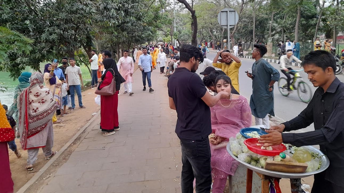 এছাড়া উঠতি বয়সী তরুণদের অনেকেই দলবেঁধে বাইক রাইড করছেন লেকের চারপাশে। কেউবা আবার ব্যস্ত সময় পার করছেন সেলফি তুলতে। রাস্তার পাশে ফুল ফেরি করা ছোট বাচ্চাদের থেকে ফুল কিনে প্রিয়জনের খোপায় অনেকেই গুঁজে দিচ্ছেন গুচ্ছ গুচ্ছ স্বপ্ন। এছাড়া বিভিন্ন ধরনের স্ট্রিট ফুড, বাদাম, পাপড় এবং চটপটি ও ফুচকার দোকানগুলোতে প্রচুর ভিড় দেখা গেছে।