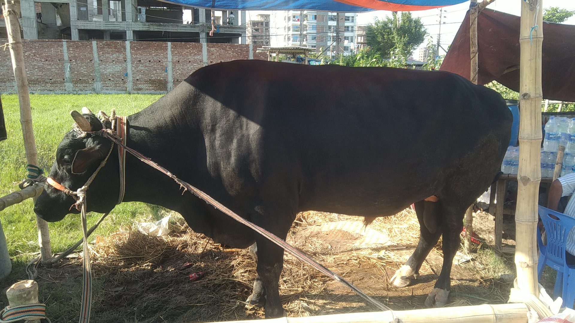 খুলনার দিঘলিয়ার পানিগাতি থেকে মালিক আসলাম মোল্লার সঙ্গে এ হাটে এসেছে গরুটি। এ একটি মাত্র গরু নিয়েই তিনি আফতাবনগর হাটে এসেছেন। বিশাল দেহের অধিকারী কালো পাহাড় নামে গরুটির চারদিকে নিরবিচ্ছিন্নভবে চলছে স্ট্যান্ড ফ্যান, যেন গরুটির একটুও গরম না লাগে। দুই/তিনজন সার্বক্ষণিক চালাচ্ছেন তার পরিচর্যা, খাবার শেষ হয়ে যাওয়ার আগেই তার সামনে ধরা হচ্ছে খাবারের পাত্র। একটু পর পর গামছা ভিজিয়ে মুছে দেওয়া হচ্ছে কালো পাহাড়ের পুরো শরীর। মাঝে মাঝে হাতপাখা দিয়েও করা হচ্ছে বাতাস। সব মিলিয়ে খুলনা থেকে সুদূর পথ পেরিয়ে ঢাকার আফতাবনগর হাটে আসা ৩৩ মণ ওজনের কালো পাহাড়ের দিন কাটছে বেশ বিলাসিতায়।