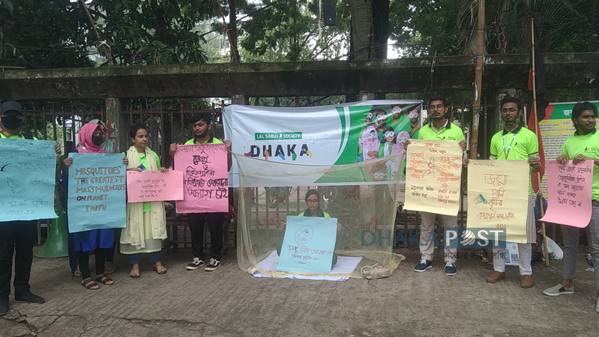 প্রেসক্লাবের সমনে ফুটপাতের ওপর মশারি টানিয়ে বসেছেন এক তরুণী। তার পাশে আরও কয়েকজন দাঁড়িয়ে। হাতে ডেঙ্গু প্রতিরোধে জনসচেতনতায় বিভিন্ন প্ল্যাকার্ড।
