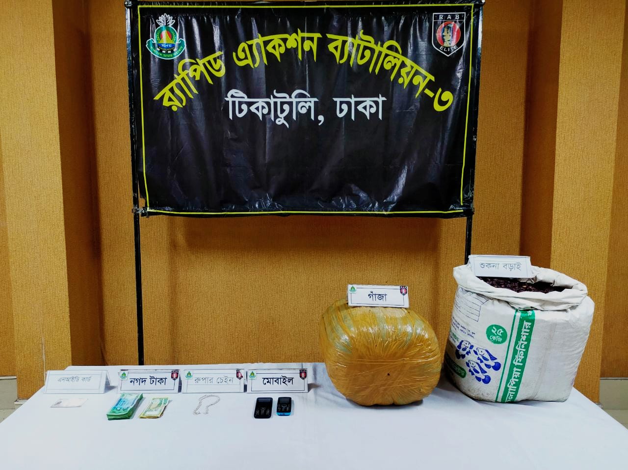 তিনি জানান, মঙ্গলবার দিবাগত রাতে সোনারগাঁও থানাধীন মেঘনা টোল প্লাজার পশ্চিমে গঙ্গানগর পুলিশ চেকপোস্টের সামনে অভিযান পরিচালনা করে কুখ্যাত মাদক কারবারি চক্রের মূলহোতা আব্দুল করিমকে গ্রেপ্তার করে র্যাব-৩। এসময় তার এক সহযোগী সেলিনা বেগম ওরফে শিউলিকেও (৪০) গ্রেপ্তার করা হয়। গ্রেপ্তারের সময় তাদের কাছ থেকে ১২ কেজি গাঁজাসহ নগদ টাকা জব্দ করা হয়।