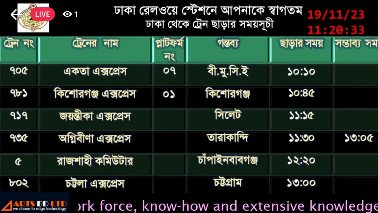 রোববার (১৯ নভেম্বর) বেলা ১১টা ২০ মিনিটে ঢাকা রেলওয়ে স্টেশনে থাকা অন বোর্ড স্ক্রিনে দেখা গিয়েছে, পঞ্চগড়গামী একতা এক্সপ্রেস (৭০৫) সকাল ১০টা মিনিটে স্টেশন ছেড়ে যাওয়ার কথা থাকলেও সেটি ছেড়ে যায়নি। তবে ট্রেনটি ৭ নম্বর প্ল্যাটফর্মে অপেক্ষায় আছে; কিশোরগঞ্জগামী কিশোরগঞ্জ এক্সপ্রেস (৭৮১) ট্রেন সকাল ১০টা ৪৫ মিনিটে ছাড়ার কথা থাকলেও সেটি এখনো ছাড়েনি কিন্তু প্ল্যাটফর্ম নম্বর এক দেওয়া হয়েছে; সিলেটগামী জয়ন্তিকা এক্সপ্রেস (৭১৭) বেলা ১১টা ১৫ মিনিটে ছাড়ার কথা তবে সেটিও ছাড়েনি; তারাকান্দিগামী অগ্নিবাণ এক্সপ্রেস (৭৩৫) ট্রেন বেলা সাড়ে ১১টায় ছাড়ার কথা থাকলেও সেটি ছাড়া সম্ভব্য সময় দেওয়া হয়েছে দুপুর ১টা ৫ মিনিটে। এই একটি ছাড়া বাকি ট্রেনগুলো কখন ছাড়তে পারে সে বিষয়ে কোন সম্ভাব্য সময় জানানো হয়নি।