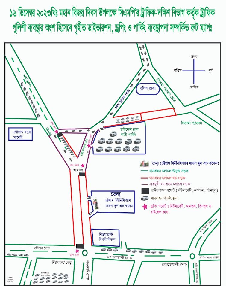 তিনি জানান, বিজয় দিবসে সরকারিভাবে চট্টগ্রাম মিউনিসিপ্যাল মডেল স্কুল অ্যান্ড কলেজ মাঠে স্থাপিত স্মৃতিসৌধে মুক্তিযুদ্ধে আত্মত্যাগকারী বীর শহিদদের স্মরণে পুষ্পস্তবক অর্পণ করা হবে। এ উপলক্ষ্যে ১৬ ডিসেম্বর ভোর ৫টা থেকে নগরের তিনপুল হতে আমতল, আমতল হতে নিউ মার্কেট এবং নিউ মার্কেট হতে আমতল রোডে সকল প্রকার যানবাহন চলাচল বন্ধ থাকবে।