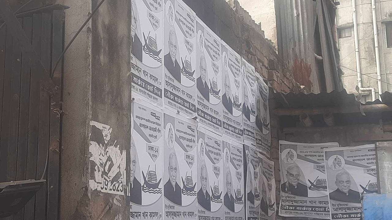 অন্যদিকে আওয়ামী লীগ মনোনীত বর্তমান স্বরাষ্ট্রমন্ত্রী আসাদুজ্জামান খানের পোস্টার পুরো এলাকাজুড়ে রশিতে বেঁধে টানানো হয়েছে। তবে নয়াটোলা রোড়ের একটি জায়গায় ৫/৬টি পোস্টার একসঙ্গে দেওয়ালে সাঁটানো হয়েছে। এছাড়া মীরবাগের একটি গলিতে ১২টি পোস্টার একসঙ্গে দেওয়ালে সাঁটানো হয়েছে। পুরো এলাকাজুড়ে তার অসংখ্য ছোট ছোট নির্বাচনী ক্যাম্প দেখা গেছে। সেখানে সমর্থকরা বসে আড্ডা দিচ্ছেন। তবে কোনও স্পিকার বা মাইকের আওয়াজ শোনা যায়নি।