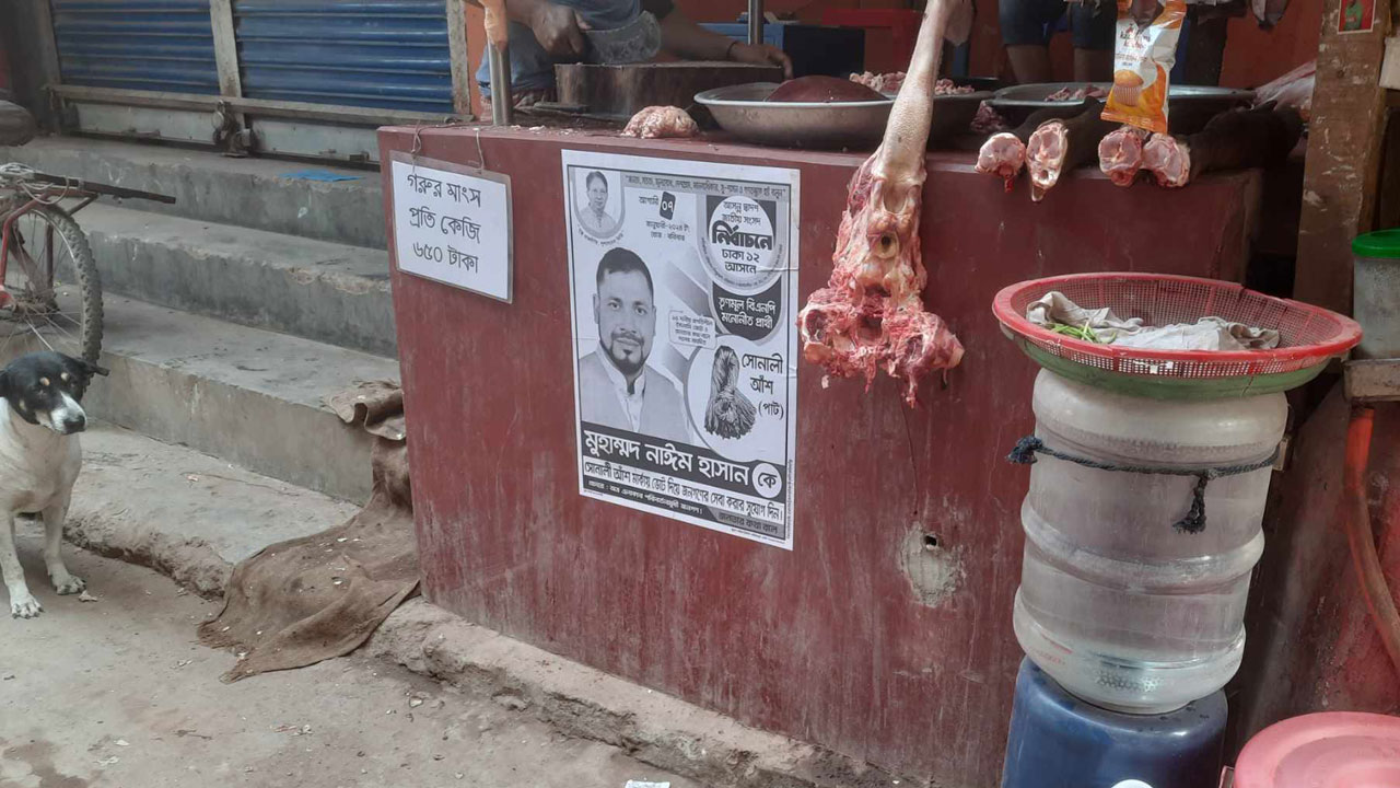 রোববার (২৫ ডিসেম্বর) সকালে ঢাকা-১২ আসনের মগবাজারের জাহা বক্স লেন, পেয়ারাবাগ, নয়াটোলা, নয়াটোল সড়ক, শাহসাব বাড়ী লেন, গ্রীণওয়ে রোড, চেয়ারম্যান গলি, আইডিয়াল পয়েন্ট, খেজুরগাছের গলি, মধুবাগ, মধুবাগ রোড, পুরাতন এলিফ্যান্ট রোড, মীরবাগের অলিগলি ঘুরে দেখা গেছে, তৃণমূল বিএনপি মনোনীত মো. নাঈম হাসানের কোনা পোস্টারই রশিতে ঝুলানো নেই। তার পোস্টারগুলো সাটানো হয়েছে গোশতের দোকানের সামনে, বৈদ্যুতিক পিলারে এবং মানুষের বাড়ি দেওয়ালে। যা নির্বাচনী আচরণবিধির স্পষ্ট লঙ্ঘন। তবে তার কোনও নির্বাচনী প্রচারণা কেন্দ্র চোখে পড়েনি।
