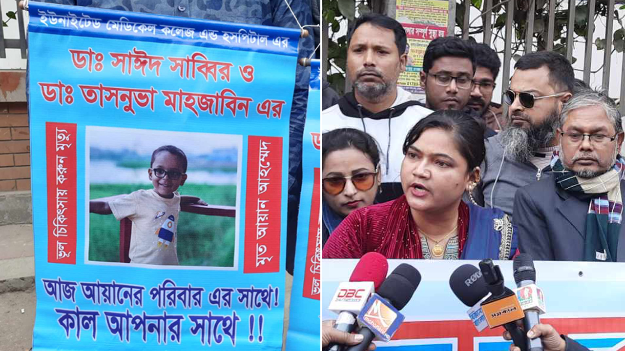 ইউনাইটেড মেডিকেল কলেজ হাসপাতালে সুন্নতে খৎনা করাতে গিয়ে শিশু আয়ানের মৃত্যুর ঘটনায় অভিযুক্ত চিকিৎসক ডা. সাঈদ সাব্বির ও ডা. তাসনুবা মাহজাবিনের আটকসহ ৬ দফা দাবিতে মানববন্ধন করছে শিশুটির পরিবার ও স্বজনরা।
