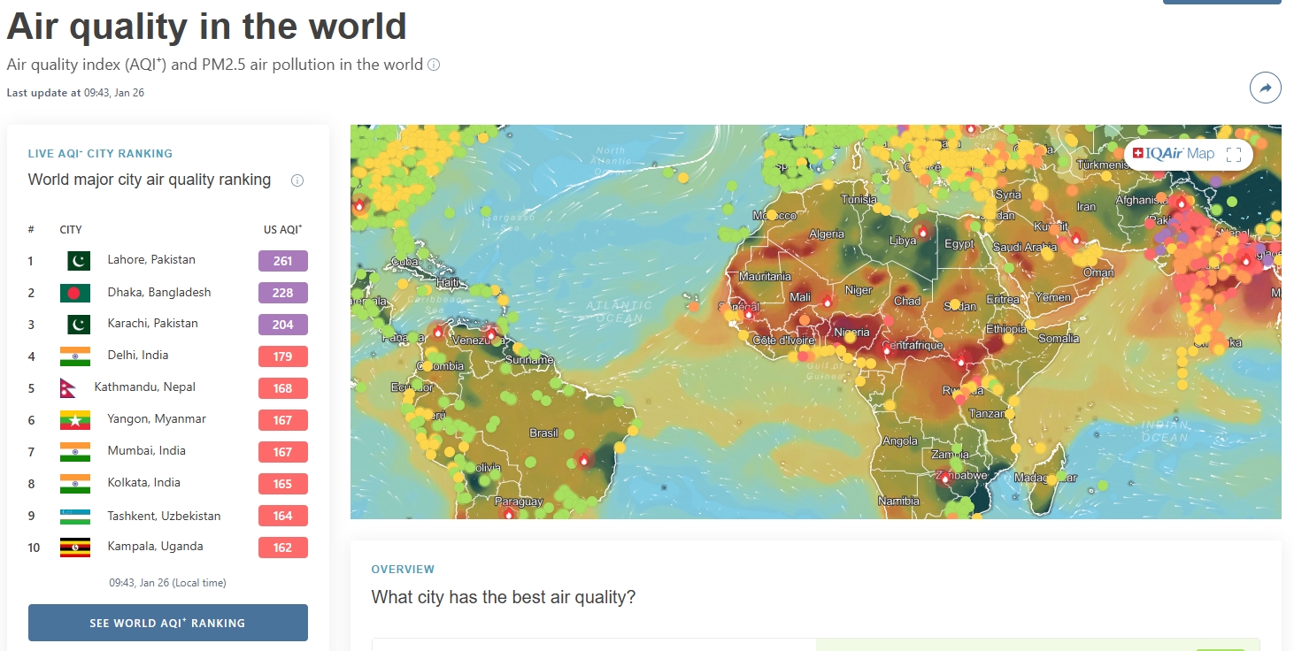 শনিবার (২৬ জানুয়ারি) সকাল সাড়ে ৯টার দিকে সুইজারল্যান্ডভিত্তিক বায়ুমান বিষয়ক ওয়েবসাইট আইকিউএয়ার-এ এসব তথ্য পাওয়া গেছে।
