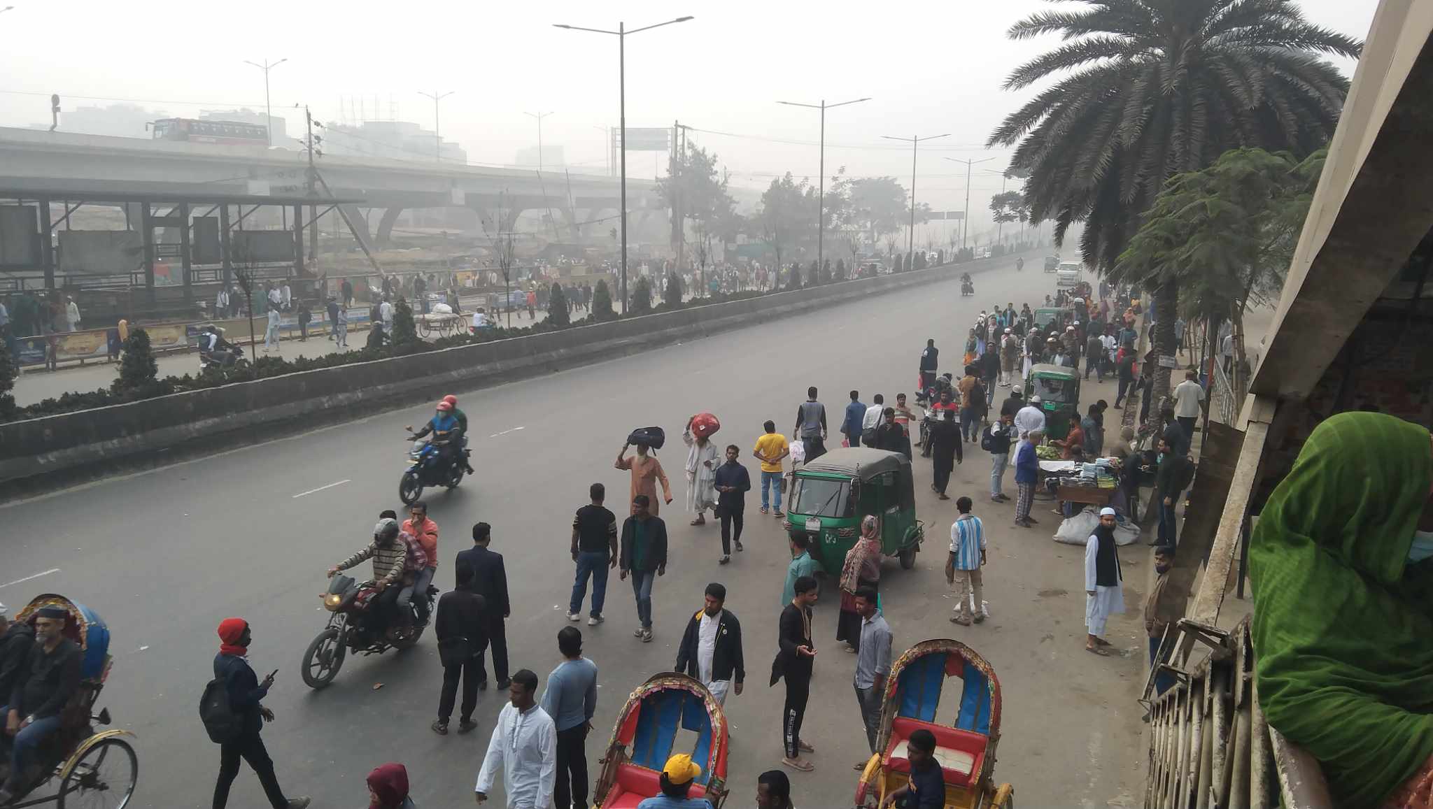 যদিও ঘন কুয়াশায় মোড়ানো রয়েছে রাজধানী ঢাকা। কুয়াশার ঘনত্ব বেশি হওয়ায় একটু দূরের জিনিস দেখতে বেগ পেতে হচ্ছে। তবুও ইজতেমা উপলক্ষ্যে সড়কে গণপরিবহন বন্ধ থাকায় হেঁটেই তুরাগ তীরের দিকে যাচ্ছেন মুসল্লিরা। আবার মাঝে মাঝে এখান ওখান থেকে পিকআপ এসে উপস্থিত হয়ে ৫০/১০০ টাকার বিনিময়ে কিছুটা পথ এগিয়ে দিয়ে আসছেন মুসল্লিদের।