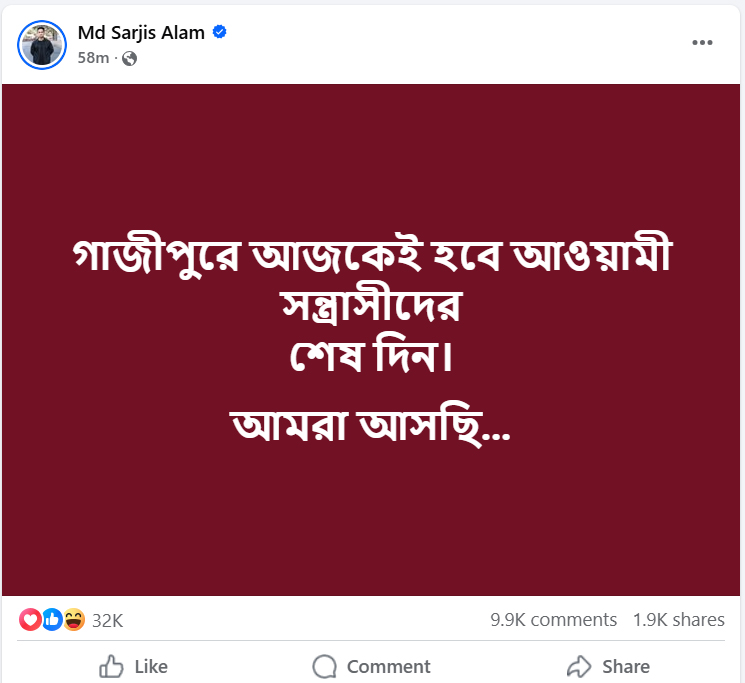 গাজীপুরে ফ্যাসিবাদী আওয়ামী লীগ সরকারের সাবেক মুক্তিযুদ্ধ বিষয়ক মন্ত্রী আ খ ম মোজাম্মেল হকের বাড়িতে এলাকাবাসীর হামলায় বেশ কয়েকজন আহত হয়েছেন। তবে আহতরা দাবি করেছেন, মোজাম্মেলের বাড়িতে তাদের ওপর হামলা চালিয়েছে আওয়ামী লীগের নেতাকর্মীরা। এমন সময় শুক্রবার দিবাগত রাতে ফেসবুকে পোস্ট দেন বৈষম্যবিরোধী ছাত্র আন্দোলনের সমন্বয়ক সারজিস আলম। এতে তিনি লিখেছেন, “গাজীপুরে আজকেই হবে আওয়ামী সন্ত্রাসীদের শেষদিন, আমরা আসছি…।”
