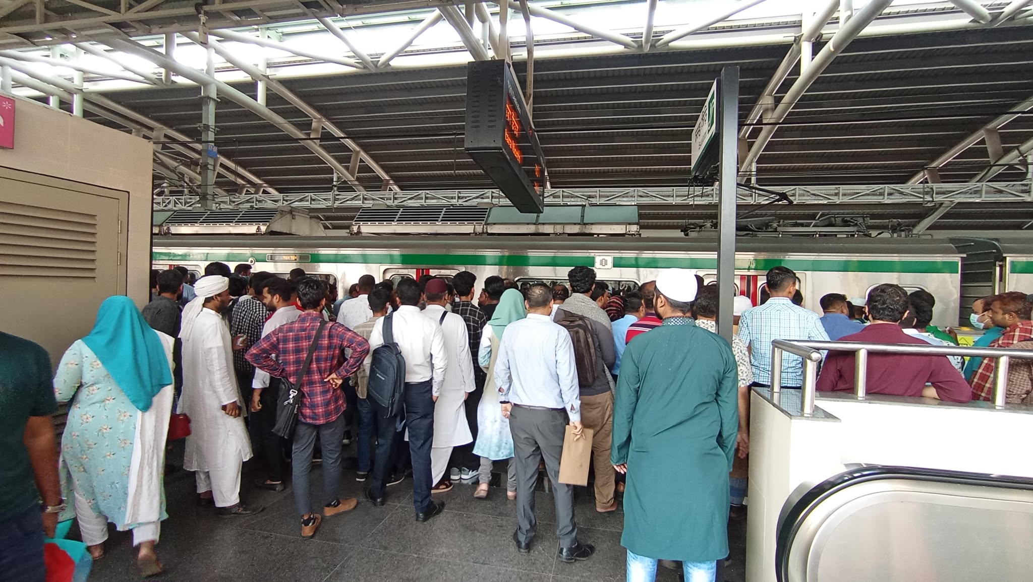 সিঁড়ি বেয়ে প্লাটফর্মে উঠে দেখা গেছে, সেখানে যাত্রীদের লোকারণ্য। খালি জায়গা পাওয়াই মুশকিল। প্লাটফর্মের প্রতিটি দরজার দু'পাশে অন্তত ১০ থেকে ১৫ জন যাত্রী লাইনে দাঁড়িয়ে আছেন। আশপাশেও আরও অনেক যাত্রী দেখা যায়। সবমিলিয়ে কয়েকশ যাত্রী স্টেশনে অবস্থান করছেন।
