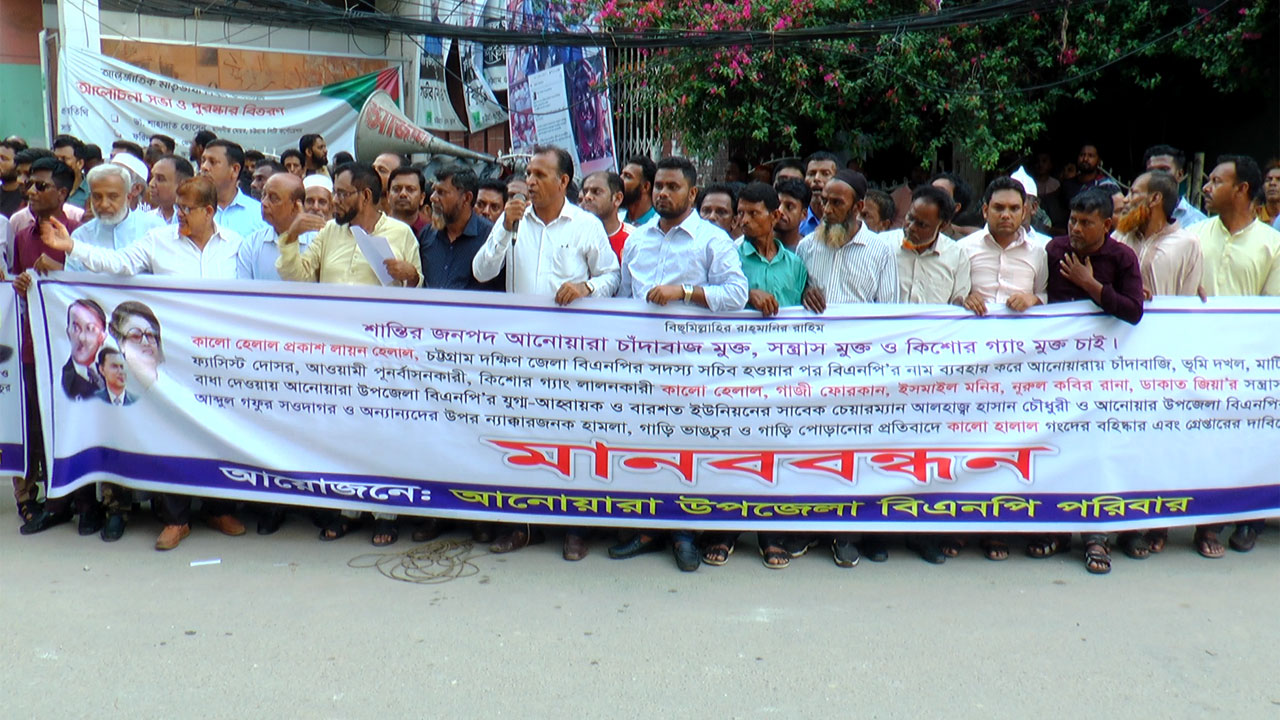 মানববন্ধনে আনোয়ারা উপজেলা বিএনপি, যুবদল, ছাত্রদল, সেচ্ছাসেবকদল, শ্রমিকদল নেতারা উপস্থিত হয়ে দাবি তোলেন, সন্ত্রাসের গডফাদার কালা হেলাল গং এর শাস্তি চাই, শান্তি চাই, নিরাপদ আনোয়ারা চাই।