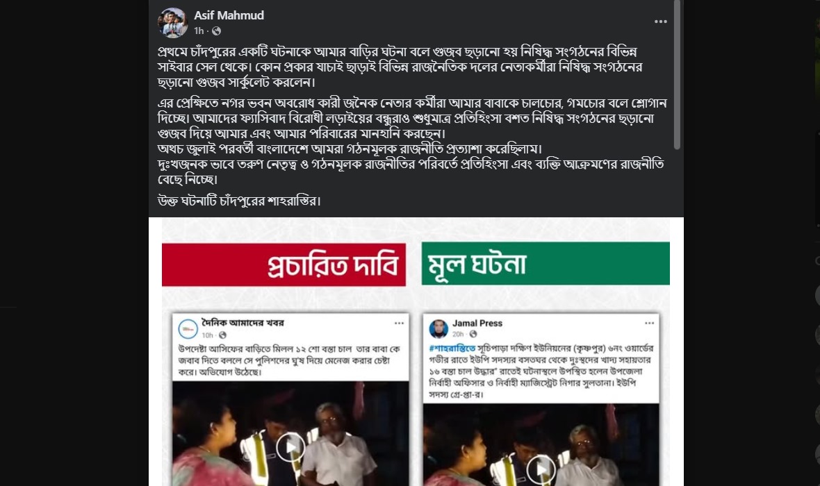 দুপুর সোয়া দুইটাই ফেসবুকে নিজের আইডি থেকে দেওয়া পোস্টে আসিফ মাহমুদ জানিয়েছেন, চাঁদপুরের একটি ঘটনাকে তার পারিবারিক ঘটনা হিসেবে গুজব ছড়ানো হচ্ছে। কোনো প্রকার যাচাই ছাড়াই বিভিন্ন রাজনৈতিক দলের নেতাকর্মীরা তা প্রচার করেছেন।