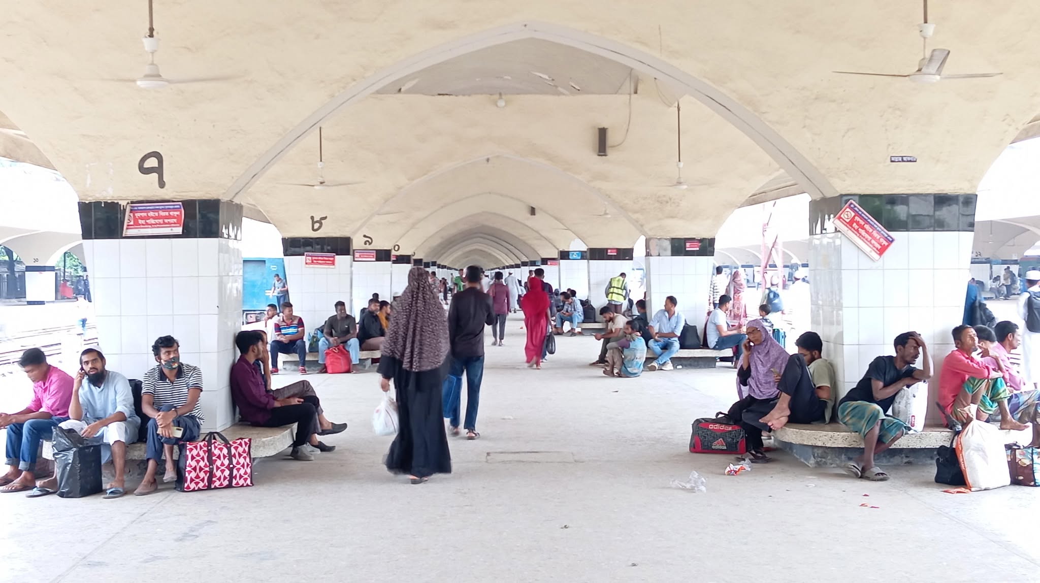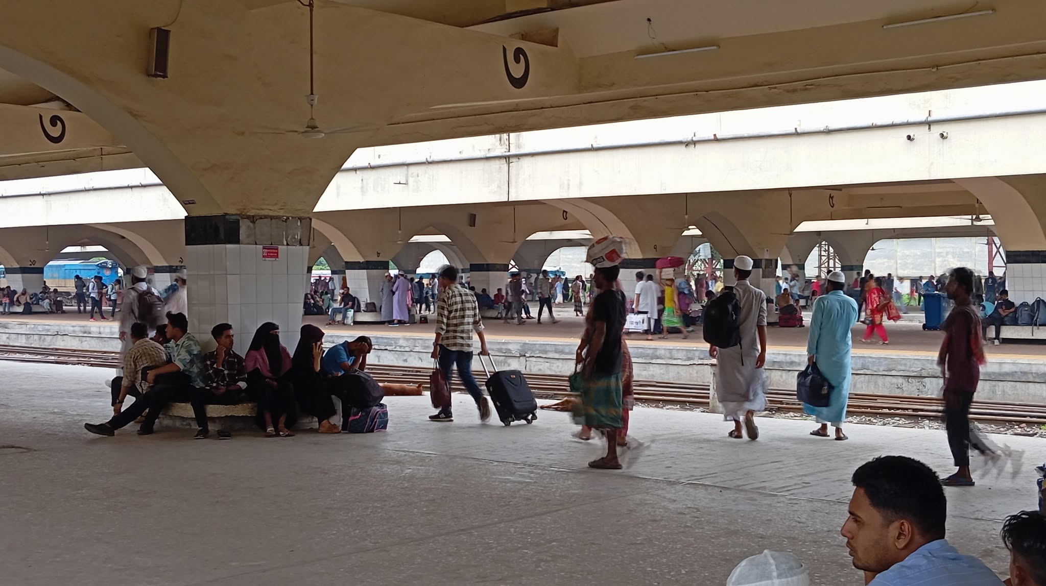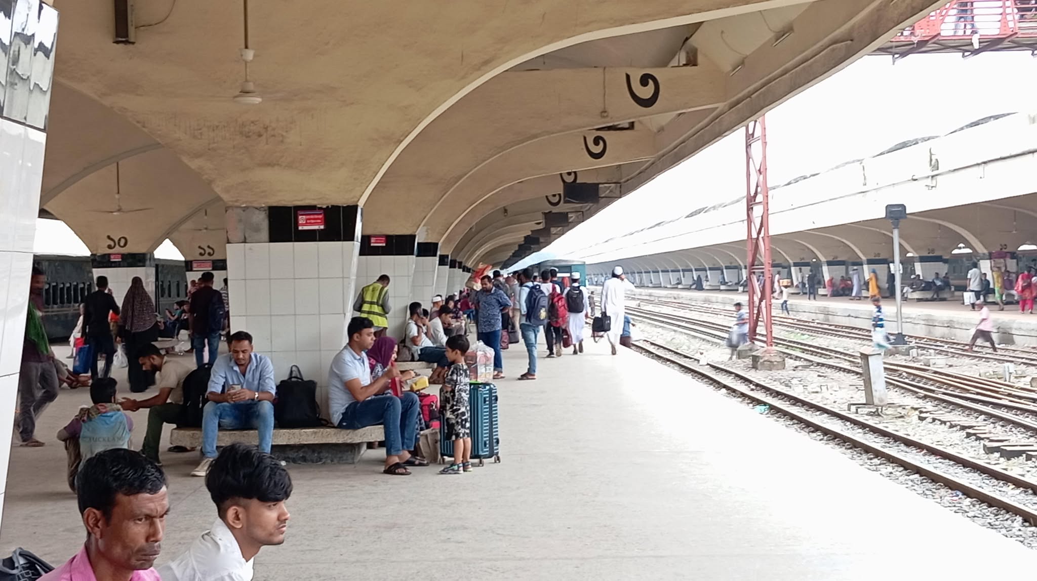 বুধবার (৪ জুন) সকালে ঢাকা রেলওয়ে স্টেশনে (কমলাপুর) গিয়ে দেখা যায়, প্ল্যাটফর্মগুলোর পাশে ও পিলারের আশপাশে অসংখ্য যাত্রী অপেক্ষা করছেন। তাদের অনেকের ট্রেন ছাড়ার সময় তখনও এক-দেড় ঘণ্টা বা তারও বেশি সময় বাকি।