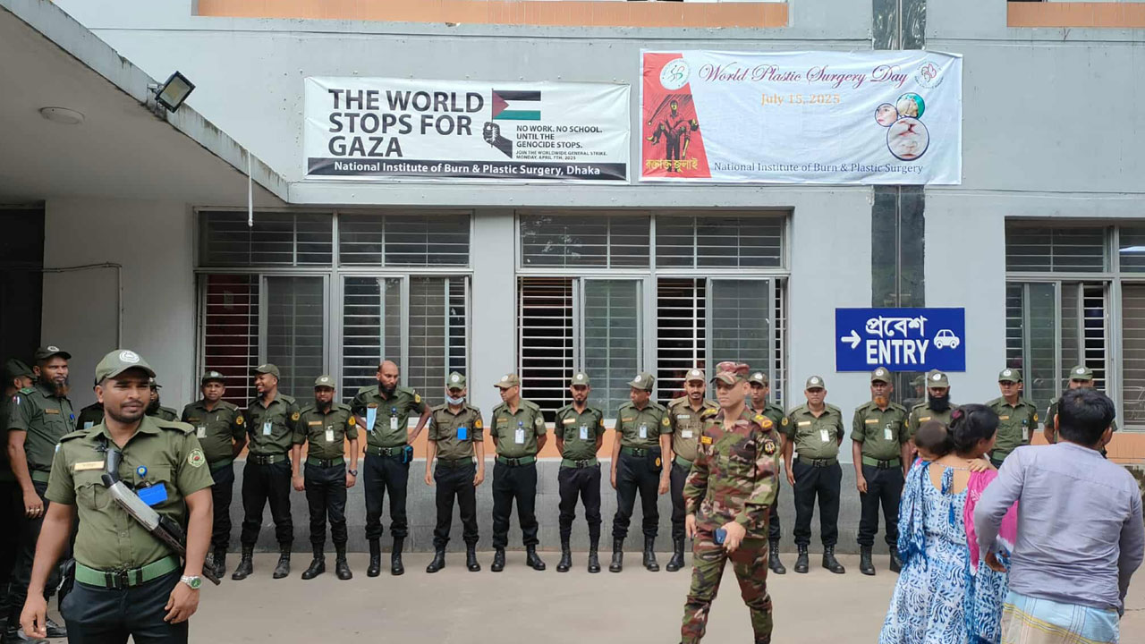 জাতীয় বার্ন ও প্লাস্টিক সার্জারি ইনস্টিটিউটের প্রধান ফটকের সামনে আনসার সদস্য ও প্রবেশমুখে সেনা সদস্যদের কড়া নিরাপত্তায় দেখা গেছে।