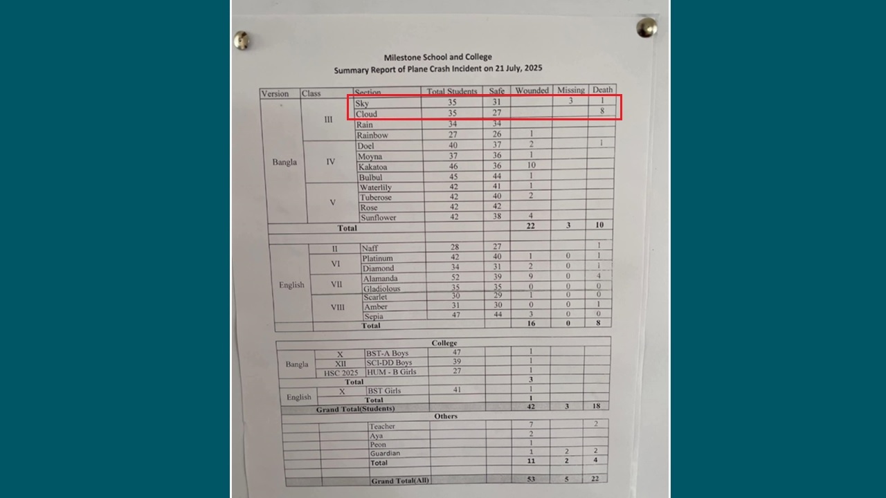 বাংলা ভার্সনের তৃতীয় শ্রেণির ‘ক্লাউড’ সেকশনের ৩৫ জন শিক্ষার্থীর মধ্যে ৮ জন নিহত, ২৭ জন নিরাপদ, এবং কেউ কেউ আঘাত পেয়েছে। একই শ্রেণির ‘স্কাই’ সেকশনে ১ জন নিহত এবং ৩ জন শিক্ষার্থী নিখোঁজ রয়েছে।