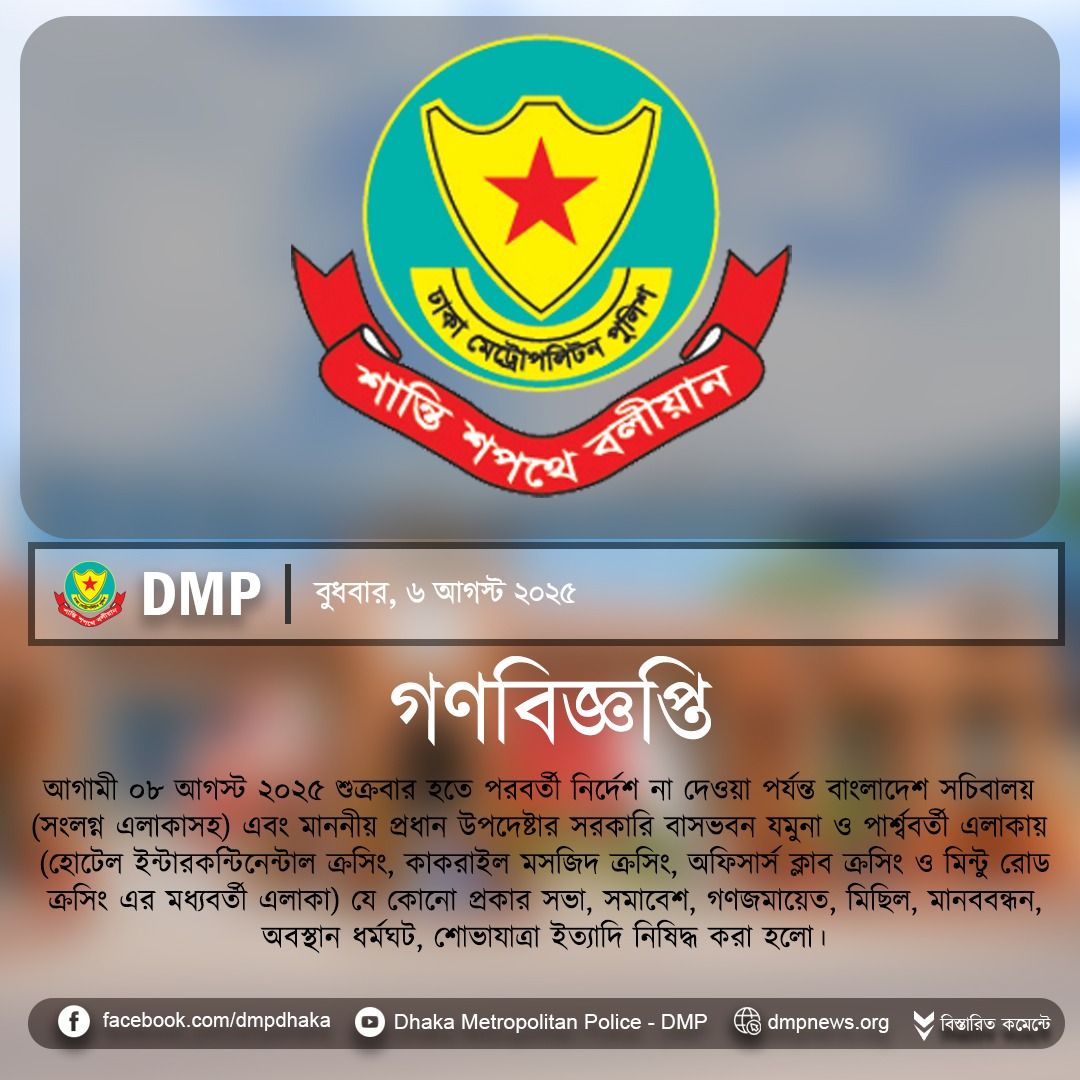 গণবিজ্ঞপ্তিতে বলা হয়, জনশৃঙ্খলা এবং প্রধান উপদেষ্টার নিরাপত্তা রক্ষার স্বার্থে ঢাকা মেট্রোপলিটন পুলিশ অর্ডিন্যান্স (অর্ডিন্যান্স নং-III/৭৬) এর ২৯ ধারায় অর্পিত ক্ষমতাবলে আগামী ৮ আগস্ট শুক্রবার থেকে পরবর্তী নির্দেশ না দেওয়া পর্যন্ত বাংলাদেশ সচিবালয় (সংলগ্ন এলাকাসহ) এবং প্রধান উপদেষ্টার সরকারি বাসভবন যমুনা ও পার্শ্ববর্তী এলাকায় (হোটেল ইন্টারকন্টিনেন্টাল ক্রসিং, কাকরাইল মসজিদ ক্রসিং, অফিসার্স ক্লাব ক্রসিং ও মিন্টু রোড ক্রসিং এর মধ্যবর্তী এলাকা) যে কোনো প্রকার সভা, সমাবেশ, গণজমায়েত, মিছিল, মানববন্ধন, অবস্থান ধর্মঘট, শোভাযাত্রা ইত্যাদি নিষিদ্ধ করা হলো।