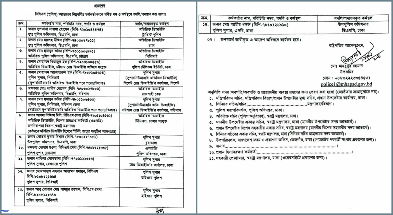 বৃহস্পতিবার (১১ সেপ্টেম্বর) স্বরাষ্ট্র মন্ত্রণালয়ের পুলিশ-১ শাখা থেকে এক প্রজ্ঞাপনে এসব তথ্য নিশ্চিত করা হয়েছে। রাষ্ট্রপতির আদেশক্রমে এতে সই করেছেন উপসচিব মো. মাহবুবুর রহমান।
