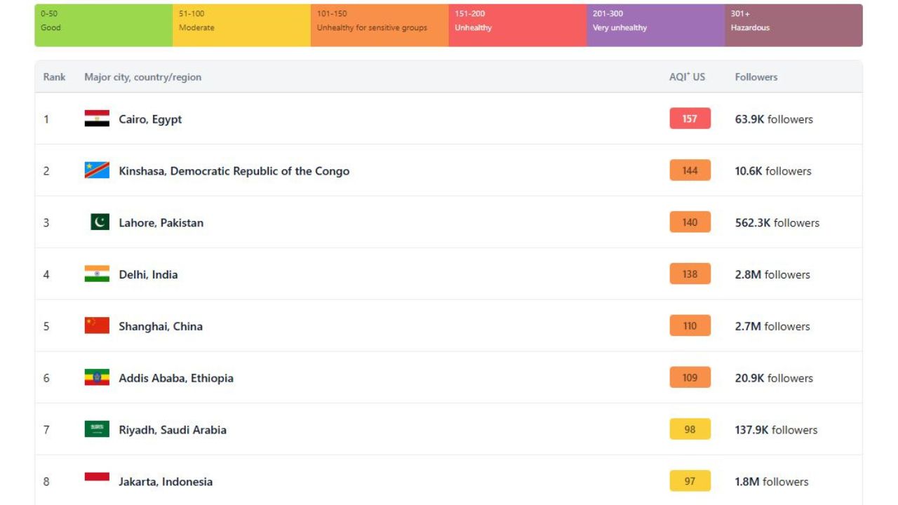 সুইজারল্যান্ডভিত্তিক বায়ুমান পর্যবেক্ষণ সংস্থা আইকিউএয়ার জানায়, কায়রোর একিউআই স্কোর ১৬৩। যা ‘অস্বাস্থ্যকর’ স্তরে পড়ে। দ্বিতীয় স্থানে থাকা পাকিস্তানের লাহোরে স্কোর ১৫৭ এবং তৃতীয় অবস্থানে থাকা কঙ্গোর কিনশাসায় স্কোর ১৫১। চতুর্থ ও পঞ্চম অবস্থানে রয়েছে যথাক্রমে চীনের সাংহাই ও ভারতের দিল্লি।