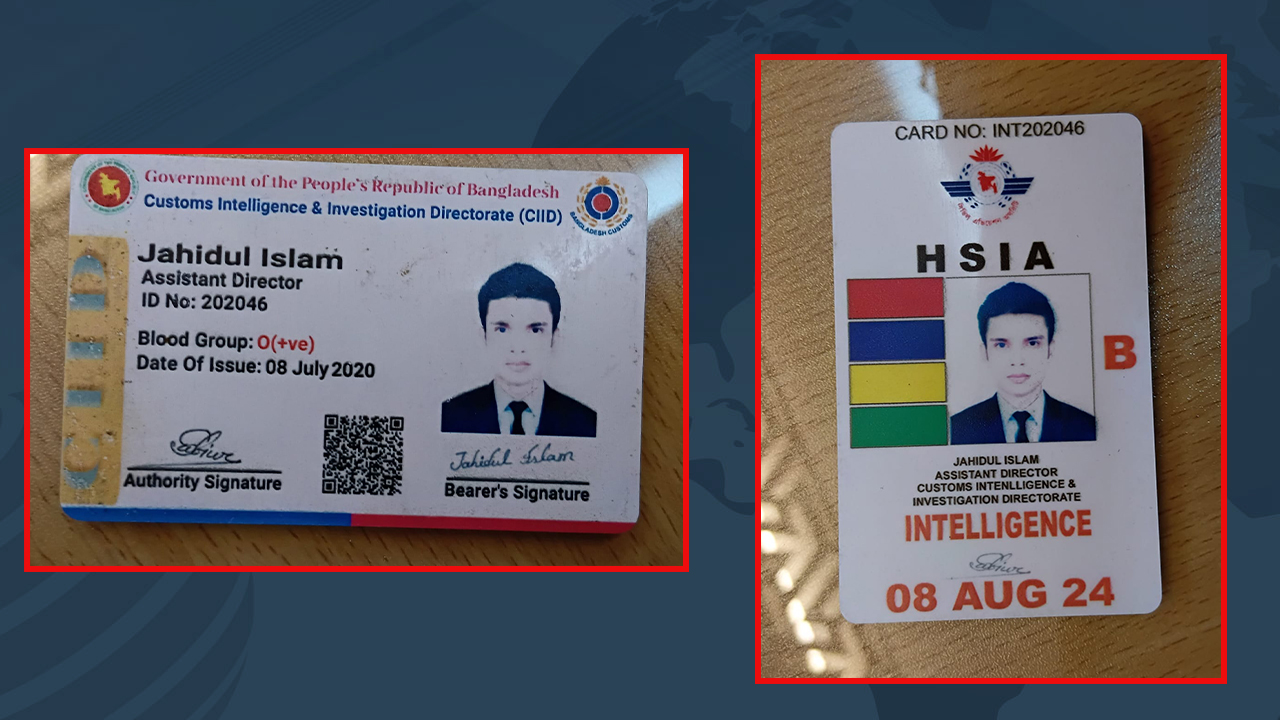 তার কাছ থেকে একটি খেলনা পিস্তল, দেখতে আসল ওয়াকিটকির মতো একটি ডিভাইস, একটি স্টিলের রড, কাস্টমসের অতিরিক্ত পরিচালক (এডি) পদমর্যাদার ভুয়া আইডি কার্ড, বিমানবন্দরে প্রবেশের ভুয়া কার্ড, মোবাইল ফোন এবং বিভিন্ন দপ্তরের একাধিক ভুয়া আইডি কার্ড উদ্ধার করা হয়।