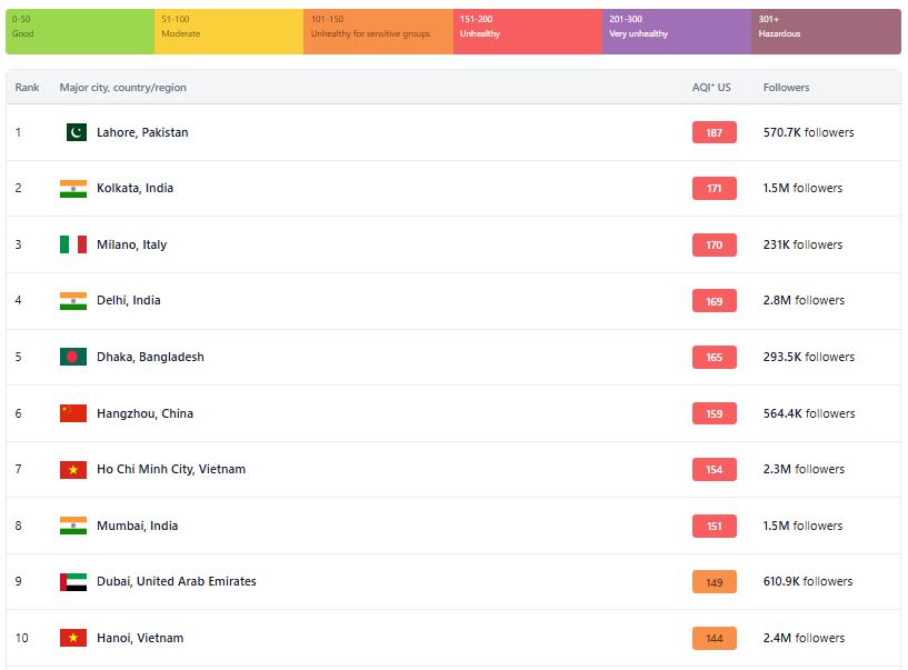 বিশ্বের দূষিত বায়ুর শহরের তালিকায় আজ শীর্ষে রয়েছে পাকিস্তানের লাহোর। বায়ুমান সূচকে শহরটির স্কোর ১৮৭। তালিকায় ৫ম অবস্থানে রয়েছে রাজধানী ঢাকা। এদিন সকালে ঢাকার এয়ার কোয়ালিটি ইনডেক্স (বায়ুর মান সূচক) স্কোর ছিল ১৬৫।