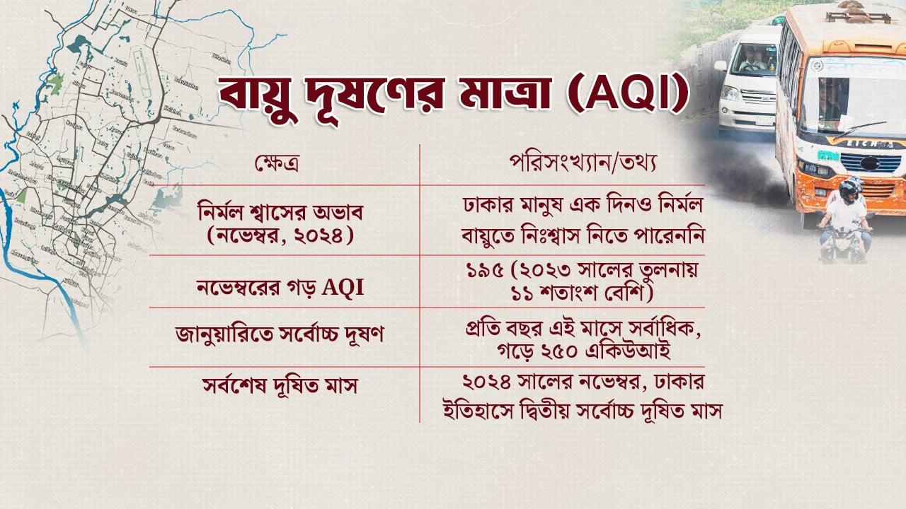গবেষণায় বলা হয়, ২০২৪ সালের নভেম্বর মাস ঢাকার ইতিহাসে ‘দ্বিতীয় সর্বোচ্চ’ দূষিত মাস হিসেবে রেকর্ড হয়েছে, যা আগের বছরের নভেম্বরের তুলনায় প্রায় ১১ শতাংশ বেশি।