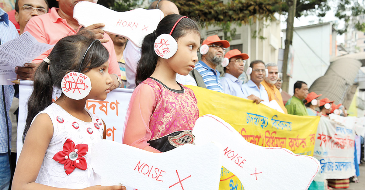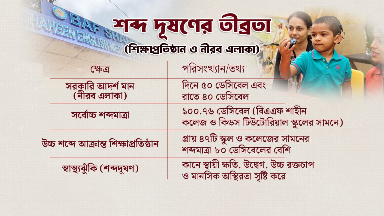 ‘নীরব এলাকা’র জন্য সরকারি আদর্শ মান দিনে ৫০ ডেসিবেল এবং রাতে ৪০ ডেসিবেল হলেও ঢাকার প্রায় ৪৭টি স্কুল ও কলেজের সামনের শব্দমাত্রা ৮০ ডেসিবেলের বেশি। যা শ্রবণশক্তি হ্রাস, মানসিক চাপ, এমনকি হৃদ্রোগের ঝুঁকি বাড়াচ্ছে বলে বিশেষজ্ঞরা জানিয়েছেন।