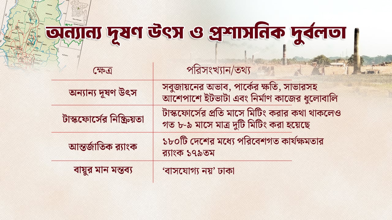 ‘সাভারসহ আশেপাশে প্রচুর ইটভাটা রয়েছে এবং সেই ইটভাটার এয়ারপোলিশন ঢাকা শহরে চলে আসে। এছাড়া, নির্মাণকাজের ধুলা একটা বড় কারণ। ঢাকা শহরে নিয়মিতই প্রচুর নির্মাণকাজ (কনস্ট্রাকশন) চলে। এই কাজের যে ধুলাবালি, তা বাতাসে মিশে সরাসরি মানুষের নাক, চোখ, মুখ ও ফুসফুসে ঢুকে যাচ্ছে। এছাড়া, দূষণের অন্যতম বড় কারণ হলো ফিটনেসবিহীন যানবাহন। এগুলোর চলাচলের কারণে কালো ধোঁয়া ও শব্দদূষণ হচ্ছে, যা বায়ুকে দূষিত করতে ব্যাপক অবদান রাখছে।’